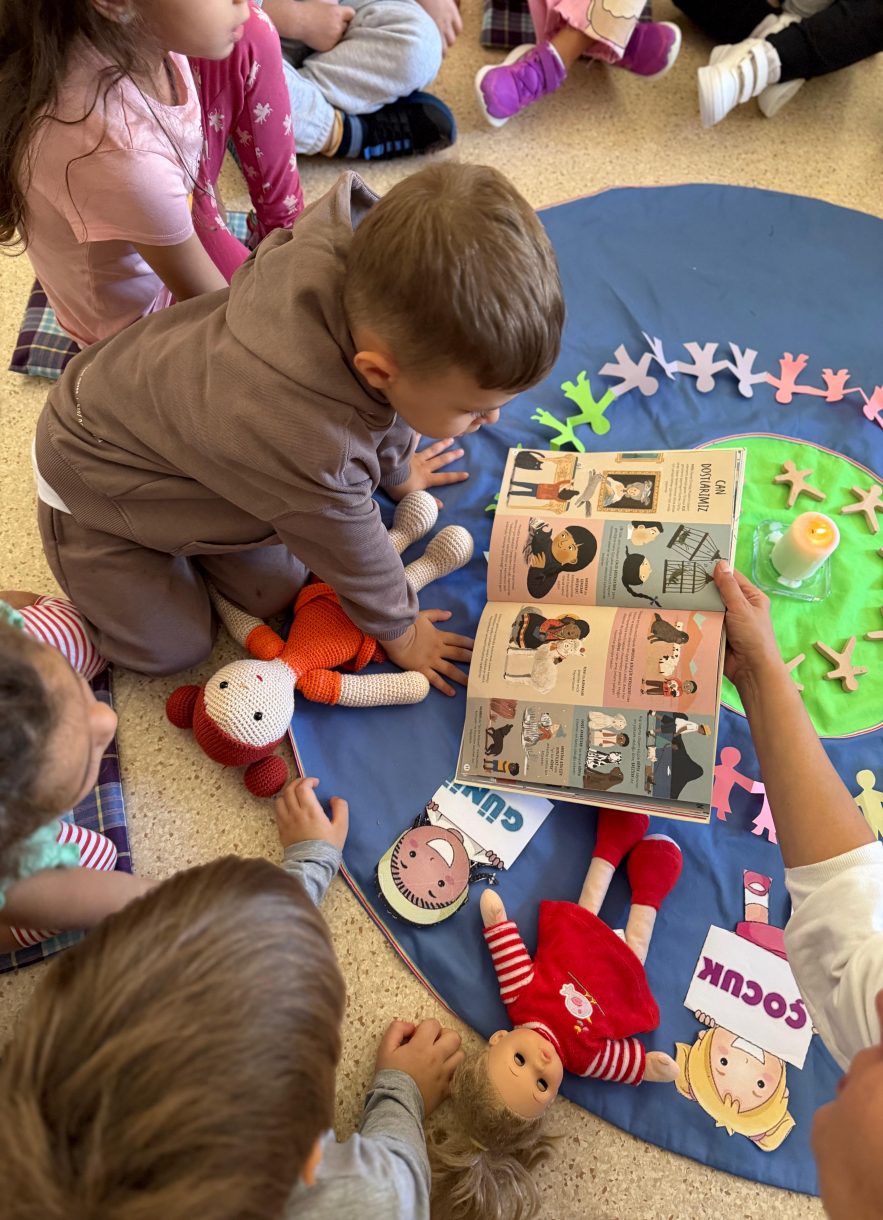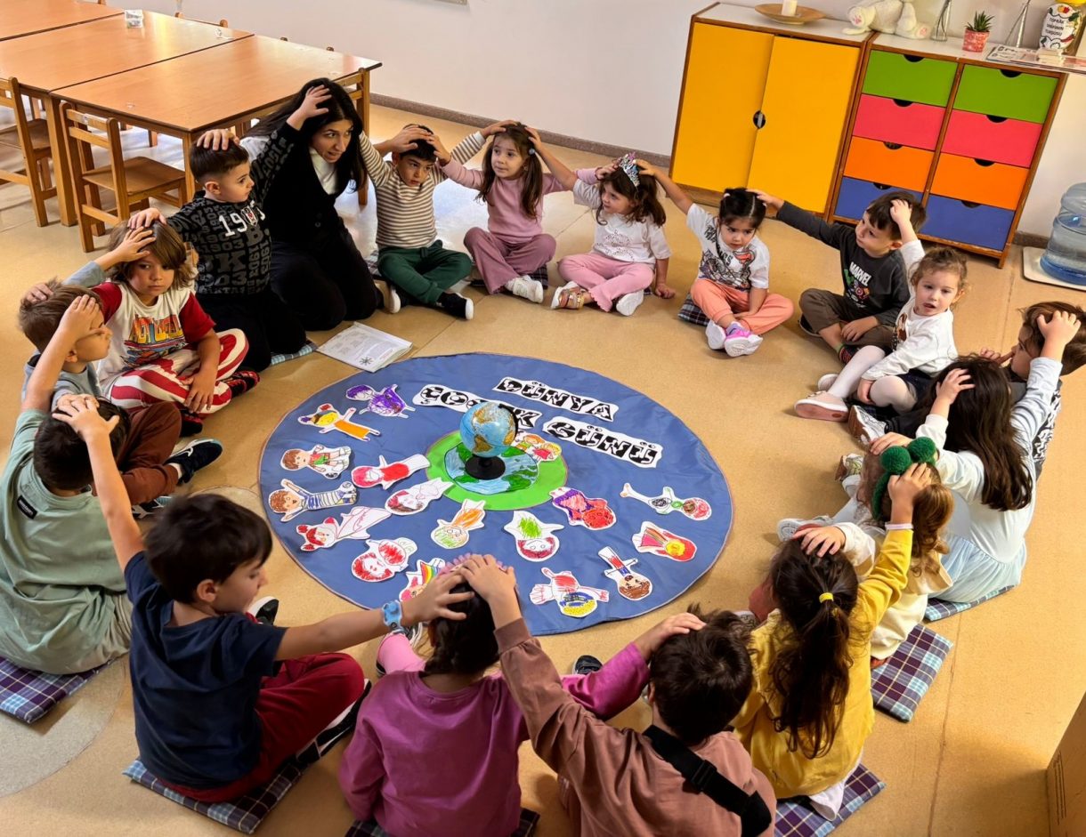 Çember etkinliğinde "Çocuk olmak neden güzeldir?", "Elinde sihirli bir değnek olsa bu dünyada neyi değiştirirdin?" ve "Bugün başka ülkelerdeki çocuklar neler yapıyor olabilir?" gibi sorular üzerine sohbet eden minikler, dünyadaki tüm çocukları düşünerek bolca sorguladılar.