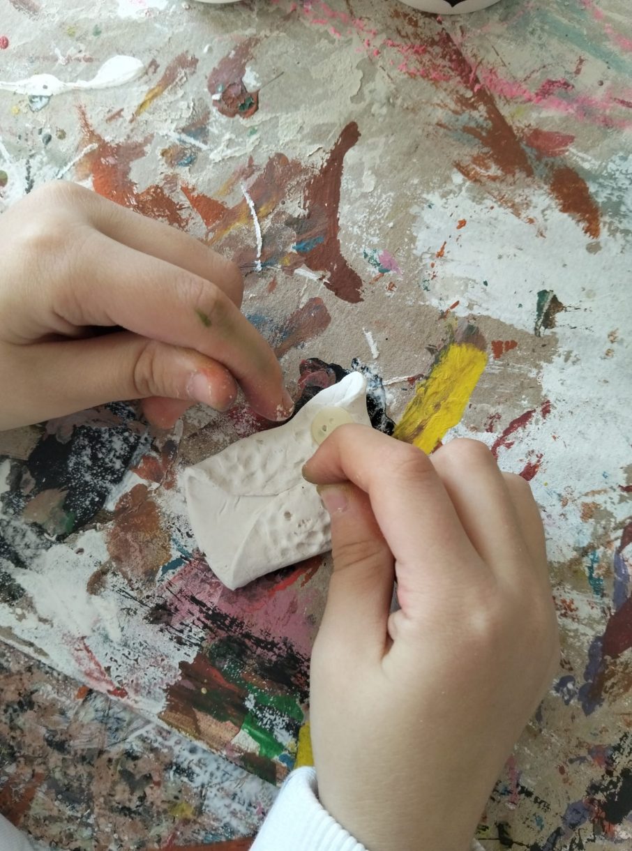 Minik öğrenciler, ilk kez çamurla tanışarak ellerini sanatın en doğal malzemesiyle buluşturdu. Serbest şekiller oluşturdular, hayallerinden ilham alarak çamurdan kolyeler tasarladılar ve kendi seçtikleri renklerle boyadıkları eserlerini tamamladılar.