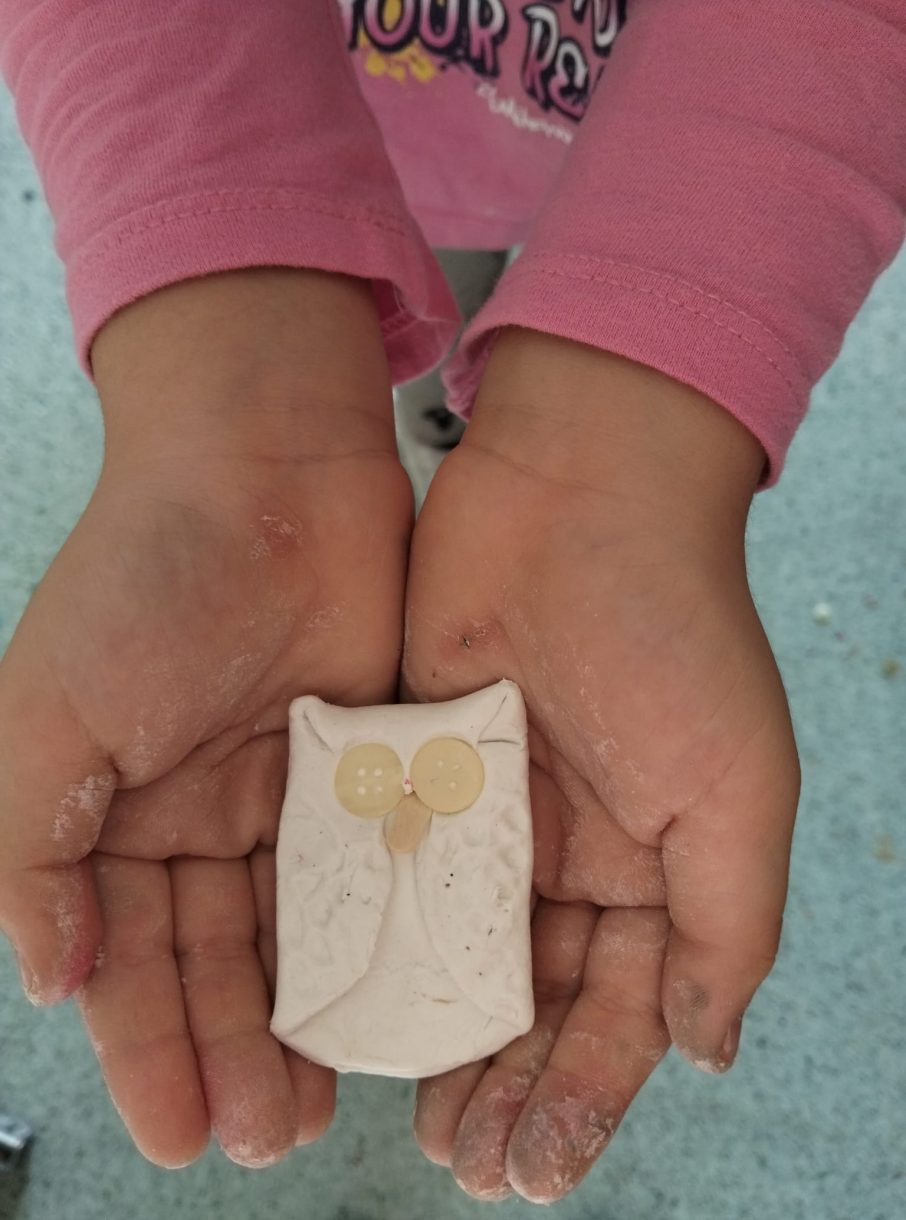 Atölyenin en heyecan verici aşaması ise seramik çamuruyla yapılan baykuş çalışması oldu. Çocuklar, elleriyle şekil verdikleri baykuşları büyük bir özenle renklendirirken hem eğlendiler hem de üretmenin verdiği mutluluğu yaşadılar.