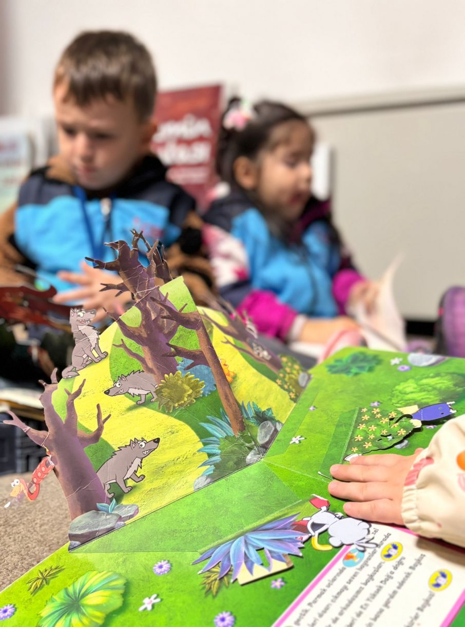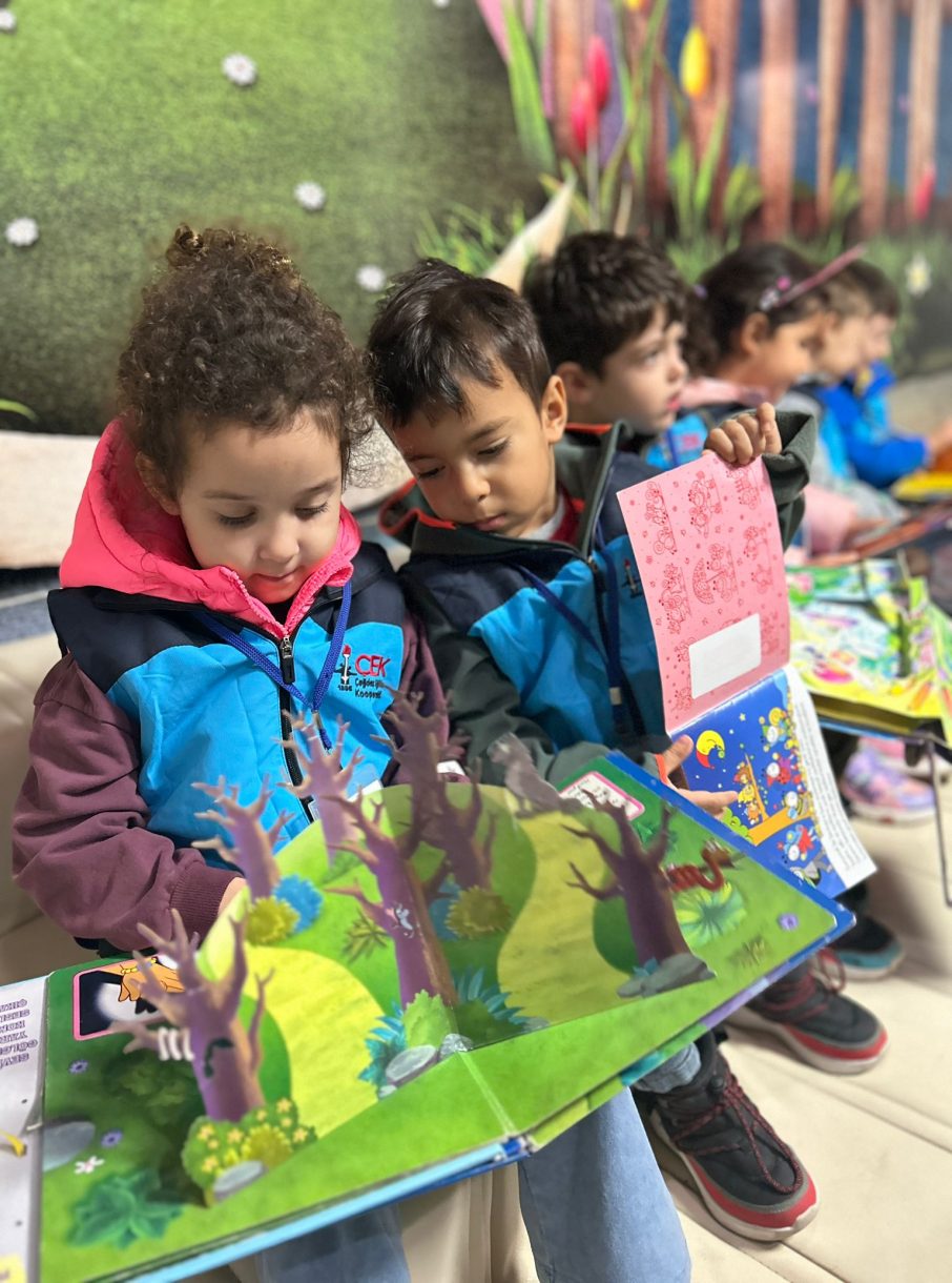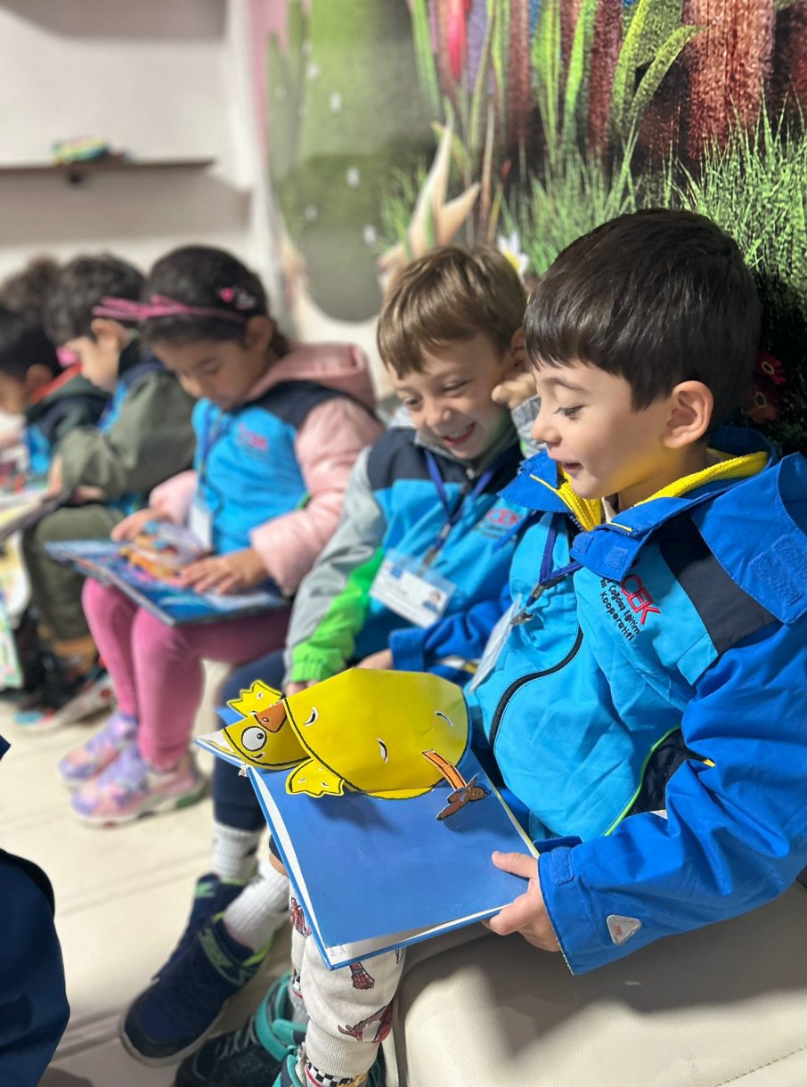 Ardından dev bir kitabın sayfaları açıldı ve hikâye okuma saati başladı. Her çocuk sırasıyla kitapları inceleme, sayfaları çevirme ve yeni hikâyelerle tanışma fırsatı buldu.