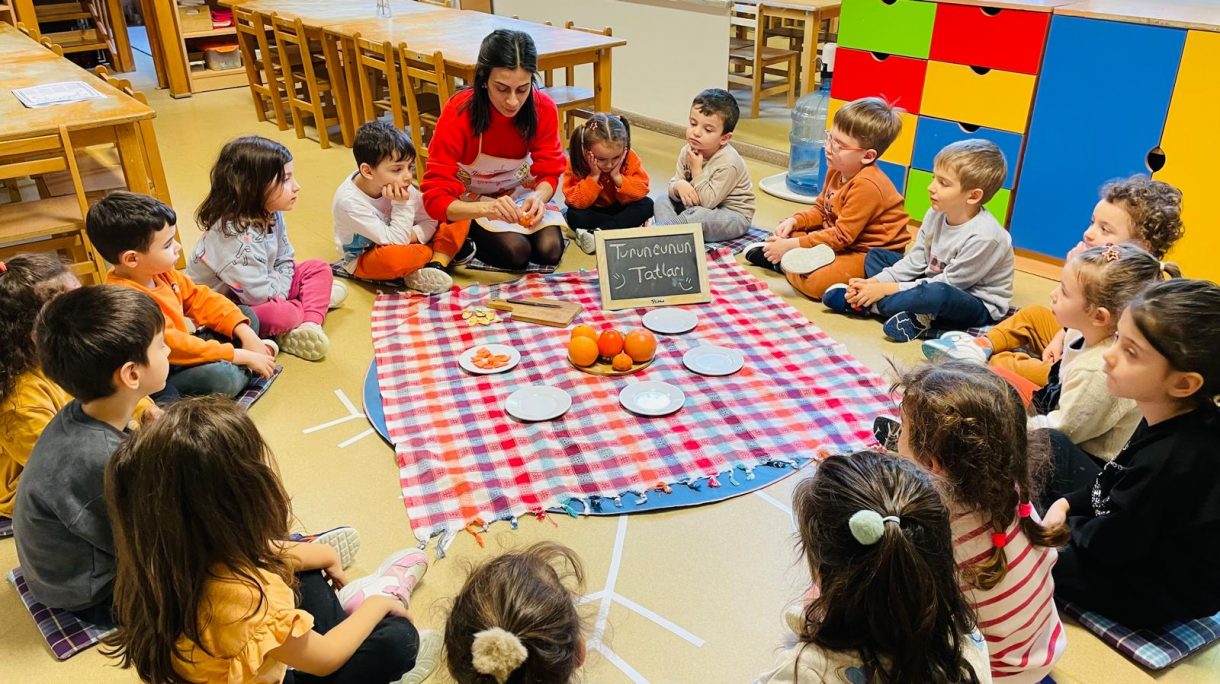 3 Mart Beşevler Anaokulu'nda kış mevsimi, doğanın sunduğu en canlı renklerden biri olan turuncu ile karşılandı. Portakal, mandalina, havuç ve balkabağı gibi kışın simgesi olan meyve ve sebzeler hem bağışıklığı destekleyen özellikleriyle tanındı hem de sınıfa sıcak bir enerji kattı.