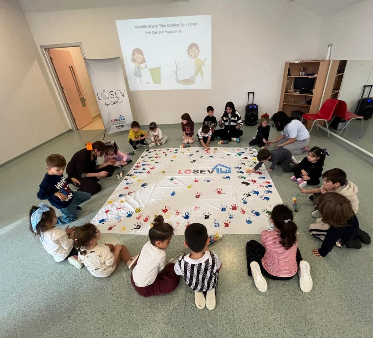Programın sonunda ise, "birlikte olmanın gücünü" somut şekilde deneyimlemek amacıyla tüm öğrencilerle el baskısı çalışması yapıldı. Her bir minik el izi, dayanışmanın ve farkındalığın sembolü oldu.