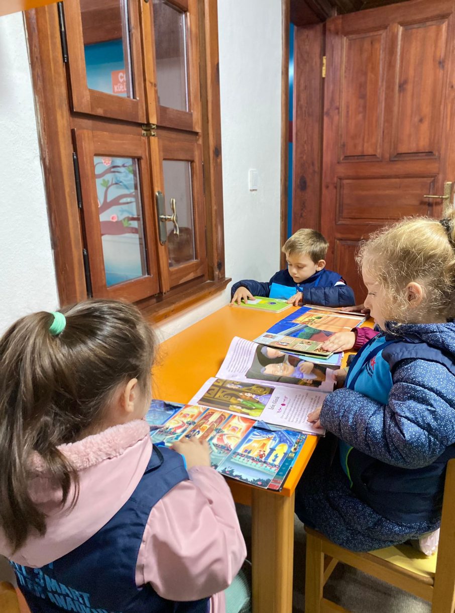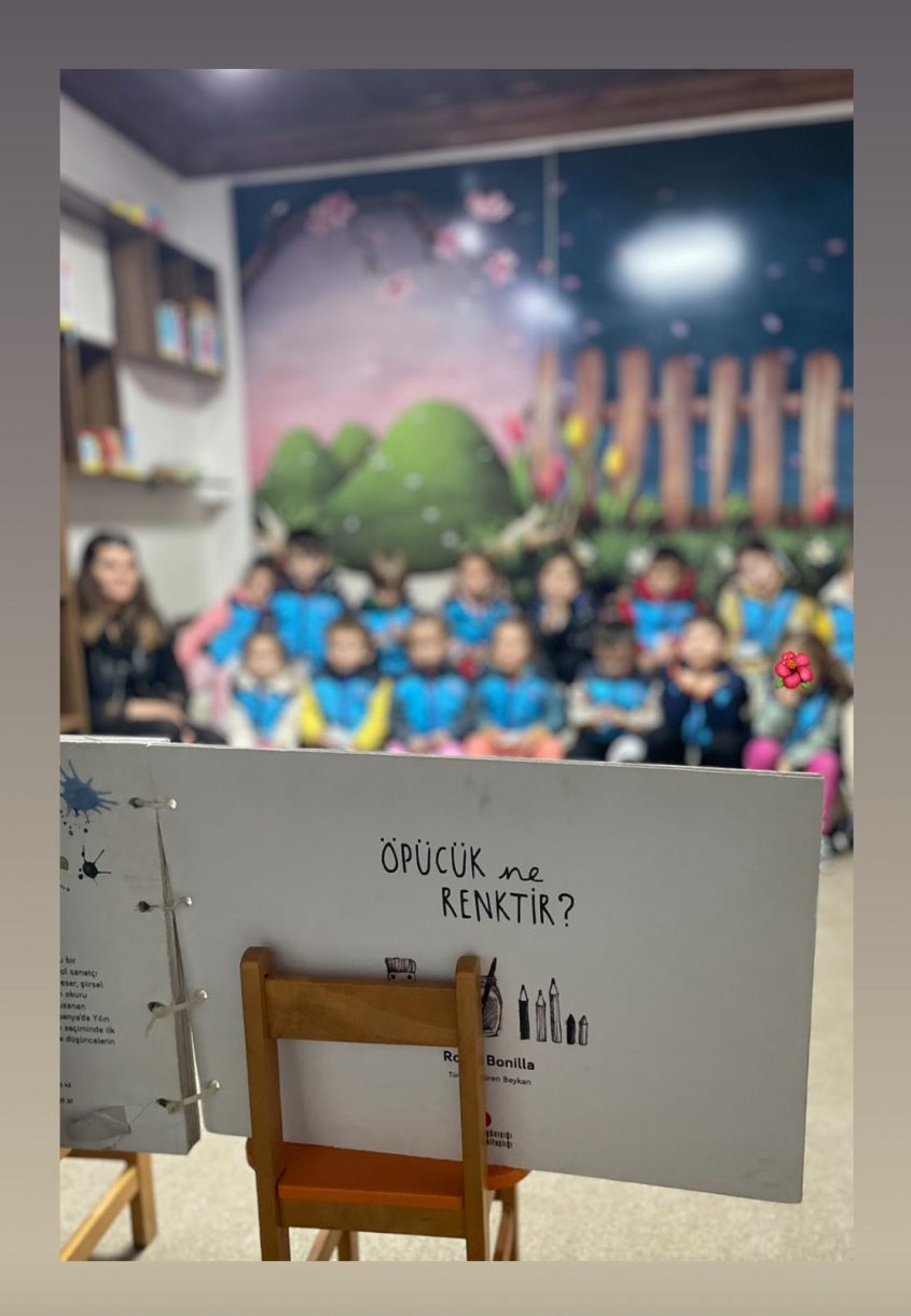 Ardından dev bir kitabın sayfaları açıldı ve hikâye okuma saati başladı. Her çocuk sırasıyla kitapları inceleme, sayfaları çevirme ve yeni hikâyelerle tanışma fırsatı buldu.