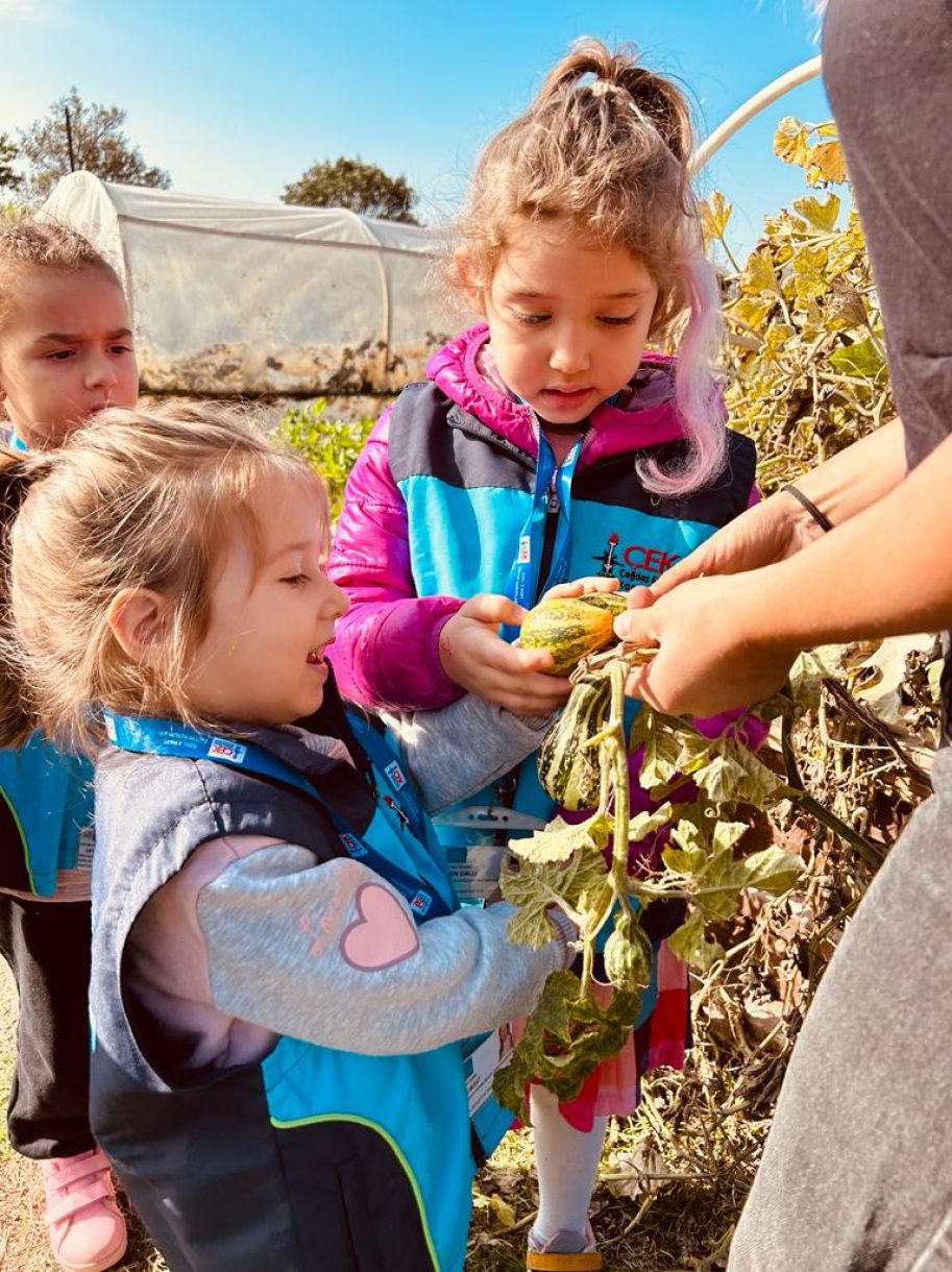Rehber eşliğinde, bostandaki "Tohum Kütüphanesi" bölümünde bulunan birbirinden farklı tohumları keşfederek, ata tohumları hakkında bilgi edindik. Ardından tohum ekimi yapılan alanlarda yetişen ürünleri gözlemledik. Aralarında en dikkat çekenler, Büyük bal kabağı, Meksika hıyarı ve siyah mısır oldu. Dalından topladığımız Meksika hıyarının görünümü kadar, tadı da çocuklar tarafından çok sevildi. Sera alanını gezerek, hava şartlarına göre dışarıda yetişmeyen ürünlerin serada yetiştirildiğini öğrendik. Ürün atıklarının değerlendirildiği kompost makinasının ne işe yaradığını dinledikten sonra, nasıl çalıştığını inceledik. Rehber tarafından okul bahçelerimize hediye edilen tohumları alan çocuklarımızla, hatıra fotoğrafı çekinerek alan gezimizi tamamladık.