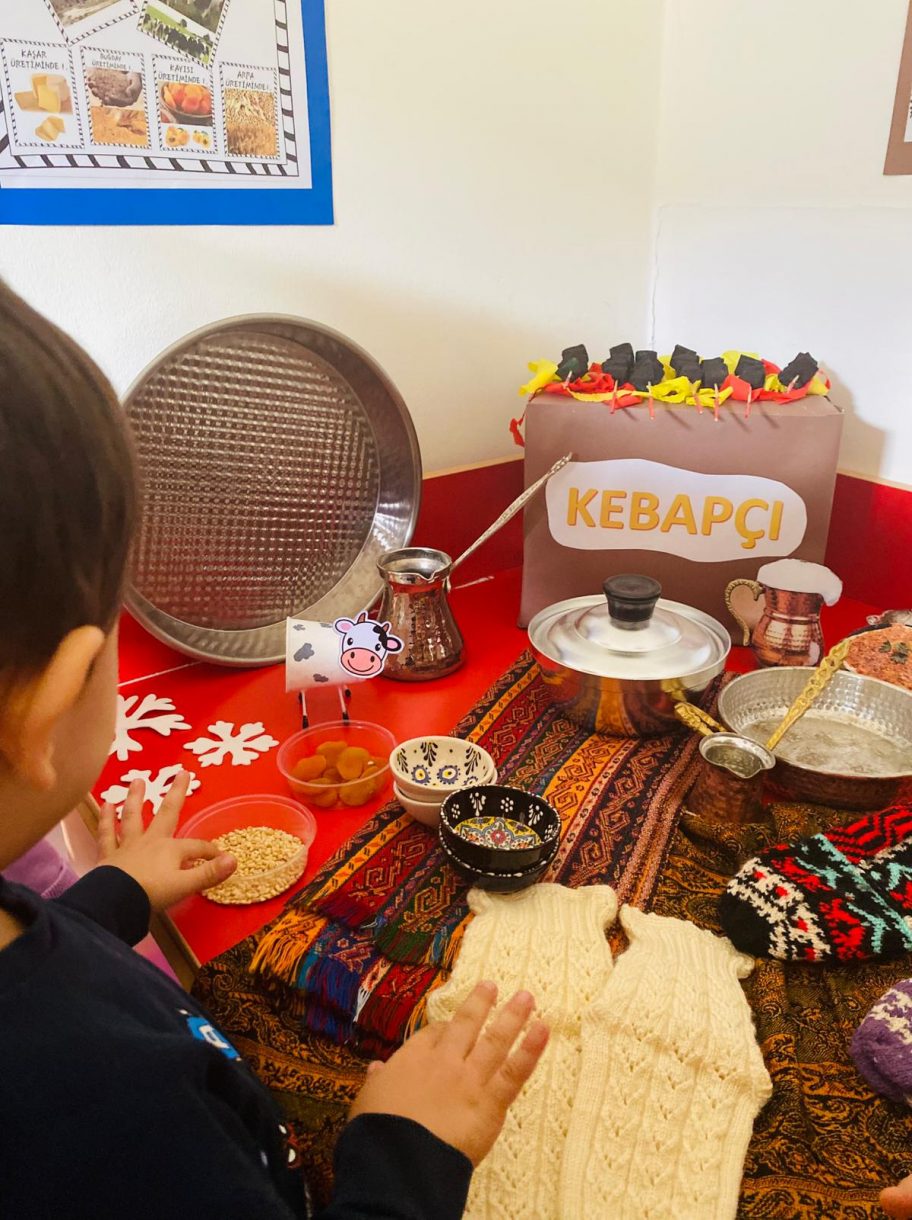Ülkemizin yedi bölgesine ait meşhur ürünlerinin olduğu drama köşesi çocukların ilgi ve odak noktası oldu. "Ülkemi Geziyorum" drama çalışmasıyla öğrenirken eğlenen minik öğrenciler, konuyla ilgili gerçekleştirilen sanat etkinliği çalışmalarında da öğrendiklerini pekiştirdi.